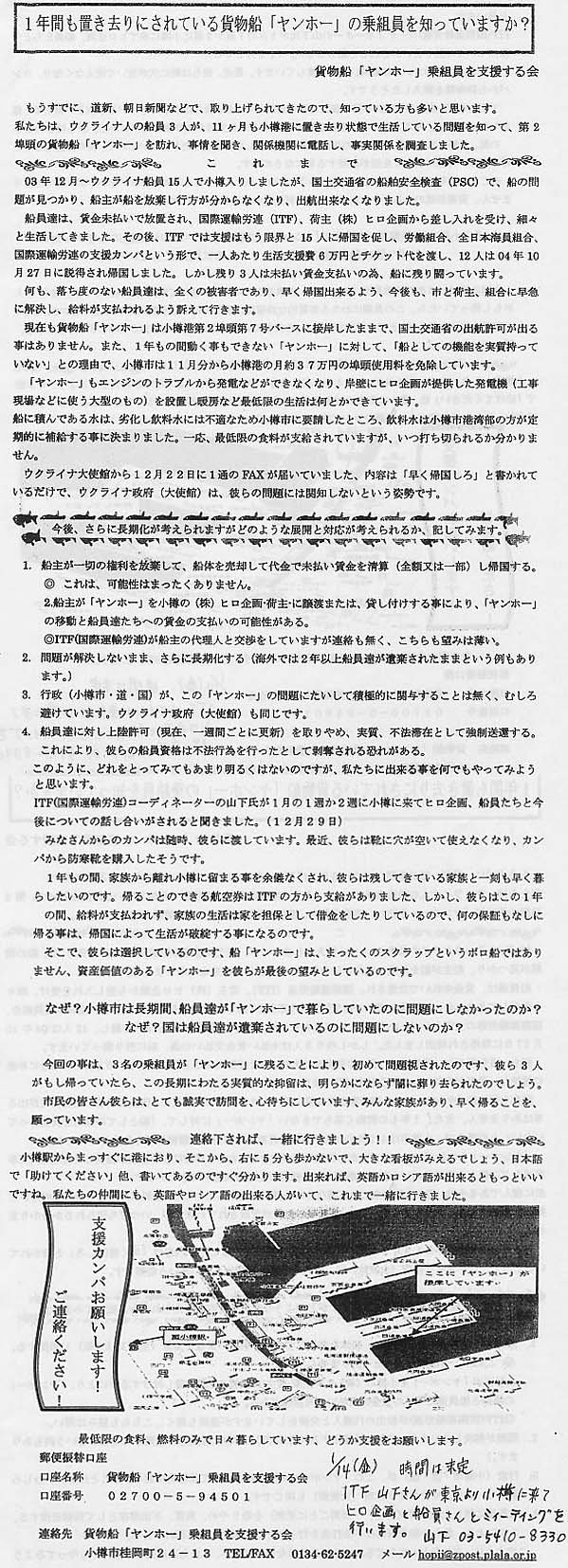 なぜ?小樽市は長期間、船員達が「ヤンホー」で暮らしていたのに問題にしなかったのか? なぜ?国は船員達が遺棄されているのに問題にしないのか?と問いかけ、支援カンパを呼びかけている。