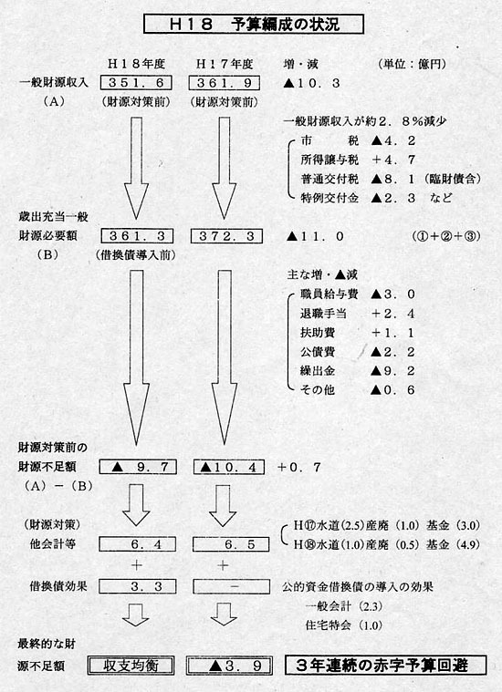 平成18年度一般財源収入351.6億円に対し、歳出の必要額361.3億円で、財源不足額は9.7億円となる。このため、財源対策として、水道・産廃・基金など他会計からの6.4億円を充当した。それでも不足する残りの3.3億円については公的資金借換債の導入を図り、3年連続の赤字予算を回避し、“収支均衡”予算にしたという。