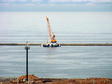 9月8日(金)には、朝から北防波堤の港内側の基礎マウンド(海底部)の整形に必要な捨石(30~300kg/ヶ)を、起重機船により投入する作業が懸命に行われていた。(写真の一部の近接撮影は、小樽開発建設部提供)