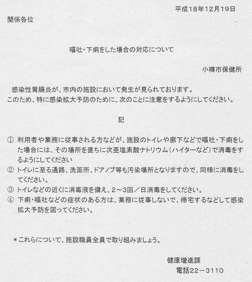 小樽市内でノロウィルスによる感染性胃腸炎の集団発生が拡大する中で、小樽市保健所(外岡立人所長)は12月19日(火)に、市内の社会福祉施設の2名の便からノロウィルスが検出されたと発表した。