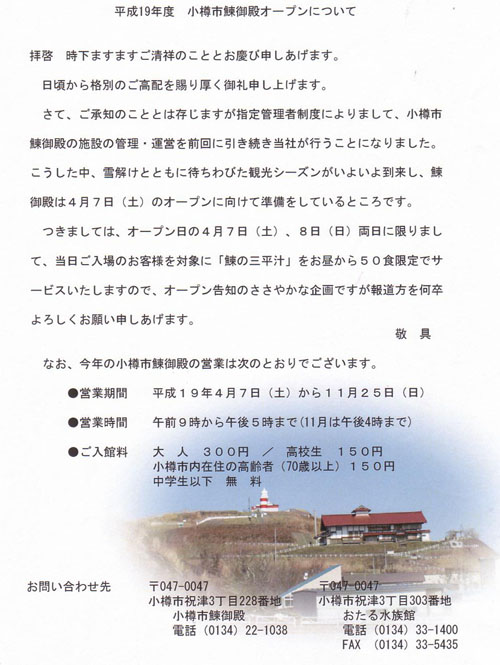 4月に入り急速に雪が消え出している市内で、4月7日(土)9:00から、祝津地区の観光名所・小樽市鰊御殿がオープンする。