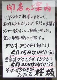 小樽花園公園にある市民会館(花園5)から撤退したニュー三幸に変わり、そば、すきやき処「おたる桜坂」が、5月15日(火)からプレオープンし、22日(火)から全面オープンする。