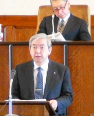 さらに、平成24年度予算編成に当たっての基本的考え方を説明。「本市の財政は引き続き厳しい状況にありますことから、『選択と集中』の視点に立って、事業の厳選に引き続き取り組むこととし、最優先課題であります財政健全化を念頭において、予算を編成したところであります。この間、歳入の確保や経費の節減を基本とし、庁内におきまして徹底的に議論を重ねたところであります」24-1council2.jpg