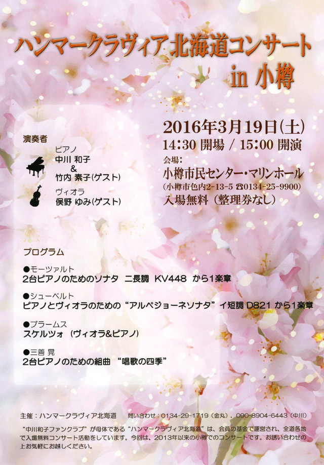 ハンマークラヴィア北海道コンサートin小樽 3月19日(土)14:30開場・15:00開演