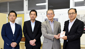 その贈呈式が、8月28日(月)10:00から、同教育長室で開かれ、山廣代表取締役をはじめ、同校・佐藤幸久学校長らが出席して行われた。