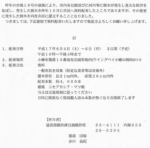昨年の台風18号で発生した倒木約4,000本の無料配布が、築港10番地先のウイングベイ小樽前の公園用地で、6月4日(土)10:00から行なわれる。