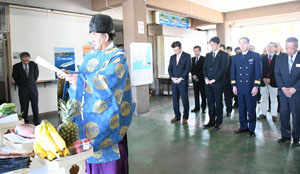 4月18日(水)10:00過ぎ、内航船客公共待合所(港町4)で、港湾関係者約40名が出席して、観光船運航安全祈願祭が執り行われた。水天宮(相生町3)の大小島平和宮司による海上安全を願う祝詞が上げられ、同社・明井代表取締役をはじめ、来賓、関係者が玉串を捧げ、今シーズンの運航の安全を祈願した。