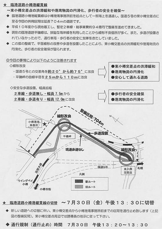新設された道路は、国道5号線の東小樽交差点から小樽港湾事務所前までの約700mの区間。これまでこの臨港道路平磯線は、狭いカーブが続き、歩道もなく、変則交差する東小樽交差点で渋滞が頻発していた。新しいルートは、これまでの歩道のない2車線・幅員7.5mから歩道有りの2車線・幅員12m、平磯岬を曲がる半径も25mから110mになり、国道5号線との交差角も約20°から75°へと大幅に改良された。
