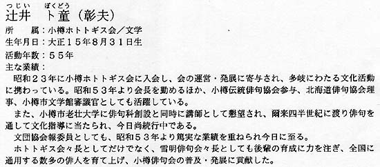 小樽文化賞は、文化貢献賞と文化奨励賞の2つがあり、小樽市文化団体協議会が選定している。平成16年度の受賞者は、昨年12月14日に開いた選考会で、貢献賞に4名、奨励賞に1名を選んだ。