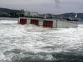 1,300トンを超す重量の、コンクリートの巨大な塊(長さ5mX幅13.2mX高さ9.6m、重さ1,368t)が、斜路式ケーソンヤード4本の木製レール124mの上を滑り落ちる。海中に達すると、大きな白波が高く舞い上がり、ゆっくりと海上に浮かび、集まった約280人の観客から、大きな歓声と拍手が巻き起こっていた。