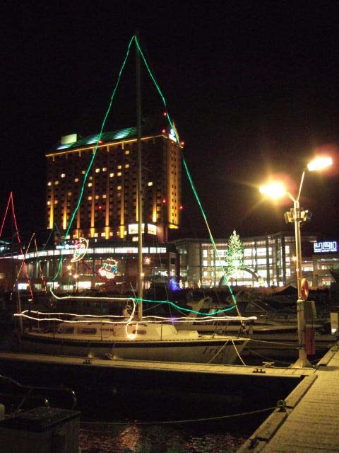 昨年は、ヨットが多彩に華やいだり、雪だるまがヨットの上で輝いたり、港に浮かぶクルーザーに巡らした電飾で、マリーナ周辺が明るくなった。今年は、コンテスト参加船艇は27艇、協力艇が37の延べ64艇が、緑・赤・青・黄色などの多彩な明かりが点滅。昨年よりも倍のボリュームのイルミネーションがマリーナ港を照らしている。ウィングベイの小樽のビッグツリーも負けずと、キラキラと輝く。