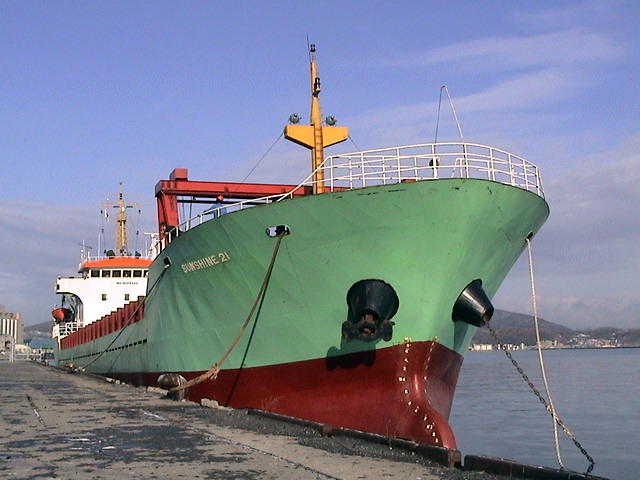 小樽で見られる老朽化したロシア船と違って、新しい赤と緑の2色の船体が目立つ「サンシャイン21」(全長83m、総トン数3,000トン)が、この新航路に就航した。