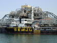 約100mの台船に載せられた、大きなパイプが縦横に走る工場施設の一部は、、強力なタグボートに曳かれ、第一陣の2隻が5月12日(金)と13日(土)に小樽港に入った。これに続く第2陣の2隻が、19日(金)と22日(月)にも続々入港してきた。