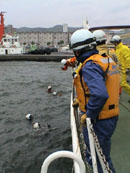 荒天の色内ふ頭では、時折激しい雨が降り注ぐ中、慣水訓練と捜索訓練が行われた。慣水訓練では、ほろべつ船首からの高所飛び込み、ドルフィン、体調確認素潜りなどを実施した。