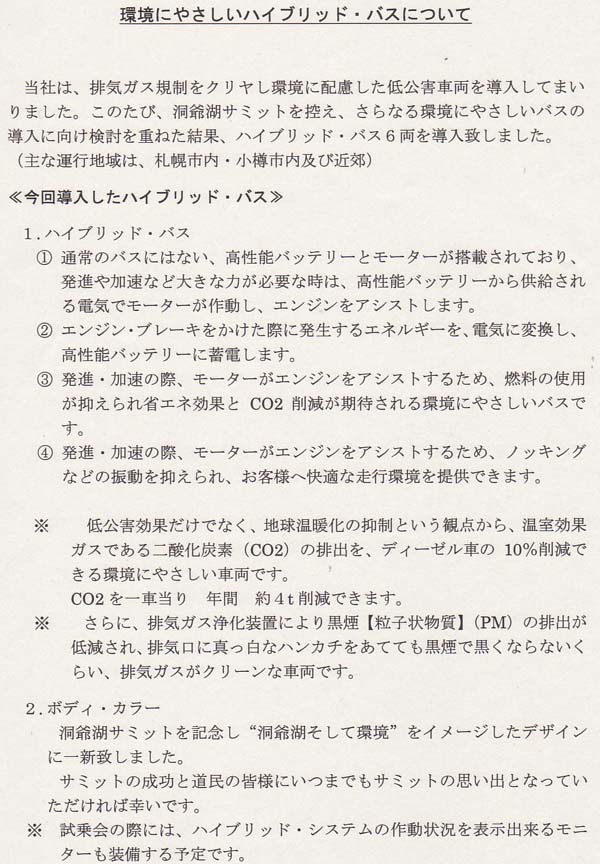 洞爺湖サミットを記念したデザインとなっており、真っ白なボディに湖の水色と山の緑色がプリントされ、車両の外装もエコ色に染まっている。車両上部にバッテリーを積んでおり、水色に白字で「ハイブリッド」と強調している。