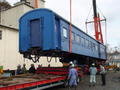9:00から、いよいよクレーン車による吊り上げ作業が行われ、青い列車の車体が車輪から外れてゆっくりと空中に浮かび、脇に置かれた大型トレーラーに下ろされた。宙に浮かぶ列車を見上げていた比良嘉恵代表は、「列車の部品を外す時にマニアが来て、部品頂戴と言われたのよね。こうやって見ると、買った時から古かったけれど、23年間使って結構ボロボロになってしまった。この列車を移動させるために、マンション建てるみたいな大作業になってしまった」 と話していた。