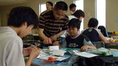 太陽電池で動く電子工作体験では、バッタやモンキー、F1、カエル、カモメなど5種類の動物・昆虫・車作りに、約10人の子供たちが興じていた。