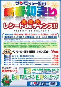 「2009年初売り福引大会」は、4日(日)10:00~18:00までの3日間、1階プラザ特設会場で行われる。同商店会各店で3,000円分を買い物すると、1回抽選することが出来る。特賞にサンポートお買物券10,000円分、1賞に3,000円分又は食品ギフトなどの商品が用意されている。