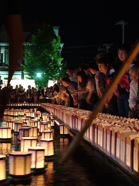 故人を追悼する灯籠流しが、8月19日(水)、小樽運河公園(色内3)で行われた。