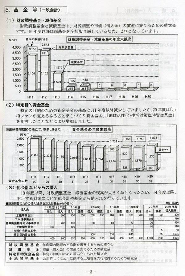 中でも、特定の目的のために積み立てられている基金からの借入れは、32基金の15億3,500万円にも達している。奨学資金基金や、青少年育成資金基金、ボランティア活動資金基金、プール建設資金基金、市立病院新築資金基金など、市民からの寄付で積み立てられた基金にも手を出している。(特定目的基金借入金残高調)