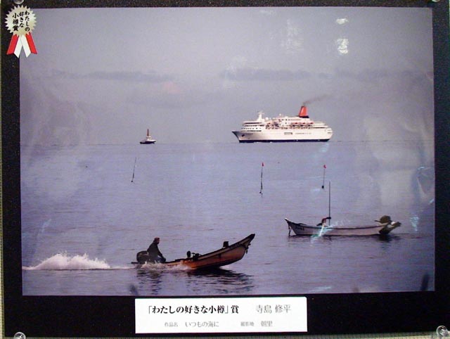 最高賞の「わたしの好きな小樽賞」に選ばれたのは、寺島修平さんの作品「いつもの海に」。朝里の海辺で船を走らせる漁師の背景に、小樽港へ向かう客船にっぽん丸が浮かぶ一枚。「海上の漁師と客船の対比が面白い」と評価された。