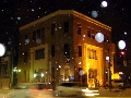 赤と白の衣装を身につけ、プレゼントを入れた白い袋を持ったサンタクロースは、市内の家々から煙突が無くなったからなのか、大きな窓から建物に入ろうと無尽ビルの壁にはしごをかけ、一歩ずつ懸命に上っている。