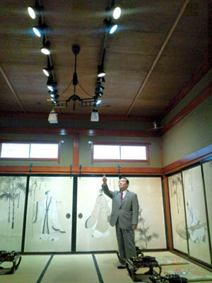 邸内の美術品を、「紫外線や赤外線から守り、そのままの色合いで後世に残したい」と、2月下旬から1ヶ月かけて、紫外線の出ないLEDランプ(1個12,000円)を80個設置した。襖書には昼白色、襖絵には昼白色と電球色の2種類を組合せて色を和らげる工夫を凝らした。