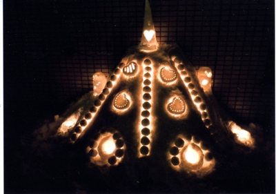 写真は、子供が、鉢で作ったスノーキャンドルを花柄模様に並べた可愛らしいオブジェを覗き込んでいる一枚。