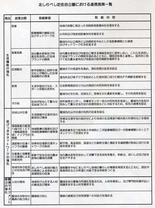 医療や産業振興、広域観光、地域公共交通などの強化を図るための15の政策分野について協議。今年の3月議会で、町村との協定案の議決を受け、このほど、 協定調印式を合同で行った。当初は、3月30日(火)の2009(平成21)年度内での調印の予定だったが、市長が、センバツ甲子園に出場した北照の応援 に行ったため、延期となっていた。