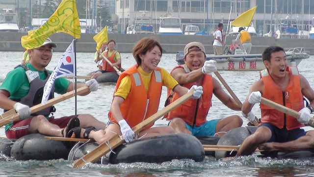 今年は、21チーム・70人が参加。小樽市民だけでなく、アメリカ人英語教師や、一人旅中の姫路出身の中学生も混合チームに入り、いかだレース大会に汗を流した。