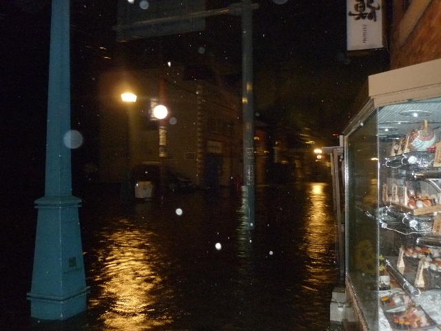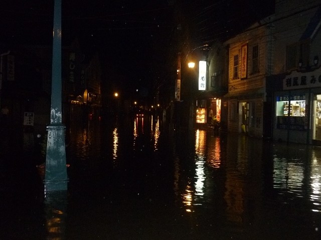 8日の堺町通りの道路冠水や床上浸水などの生々しい様子が、同所に店を構えるおたる巽鮨から本社に寄せられた。