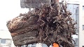 周囲を掘り起こし、根をわしづかみにし、何度も上下左右に揺れ動かした。根は、地面深く入り、横にも広がっており、最初はビクともしなかった。重機との力相撲を何度も演じた後、約3時間かけ、根は引き抜かれた。