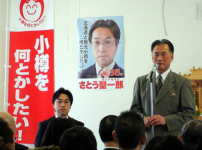 この声に対し、参会者からは賛否両論の声が挙がったが、佐藤静雄氏は、「色々話が出たが、今日は、佐藤聖一郎の事務所開き。その一点でお願いしたい。昨年、子供があちこちで運動を始めました。自分一人でやるから父親は動くのは止めてくれと言われてましたが、今年になってから街を歩いてきました。皆さんから今のような内容を次々聞かされるが、私は、4年前に市長選挙に出て、残念ながら敗れたわけです。しかし、その後の小樽の状況は十分に承知しております。多くの皆さんの考えはどうなのか、市民は小樽市をどうしようとするのか、どういう判断をするのか、十分聞いております。皆さんの悩みとまた私に対する期待は十分に分かりますが、今日は聖一郎の事務所開きですので、私は十分に考えながら判断をさせて頂くとだけと申し上げる」と、出馬に含みを持たせる発言があった。