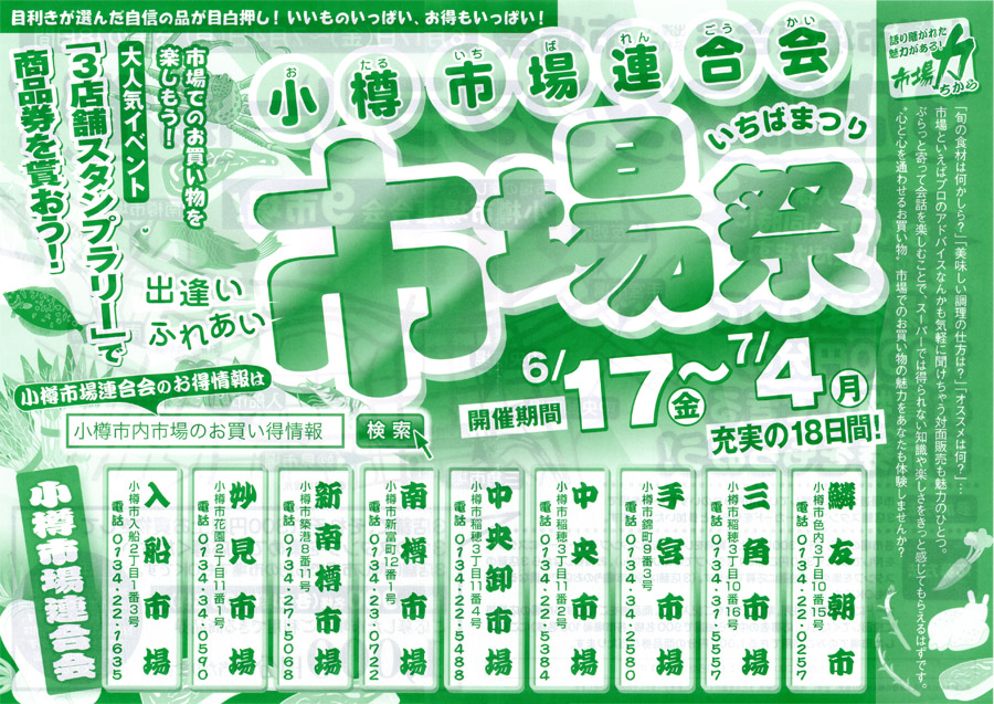 市内の9市場が集まる「小樽市場連合会」では、6月17日(金)〜7月4日(月)の18日間、小樽の市場祭を開催し、3店舗スタンプラリーを実施する。