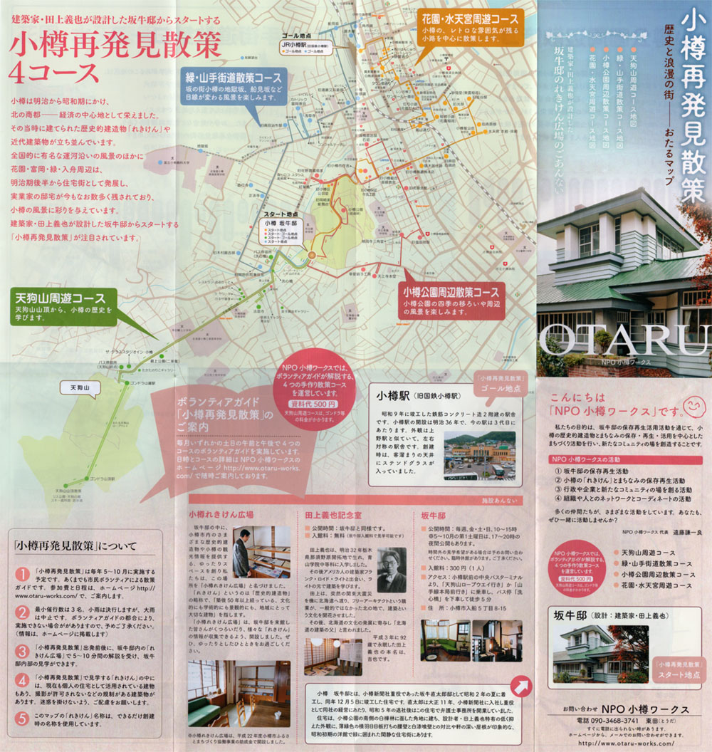 このマップを発行したのは、市内入船にある、建築家・田上義也設計の坂牛邸の管理運営を中心に、小樽市内の歴史的な建物を保存再生する活動をしている「NPO小樽ワークス」(遠藤謙一良代表)。