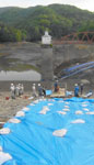 今年の6月下旬から、濁りを伴う漏水量が増加してきたことから、7月6日に、勝納川の取水ゲートを閉じて調査してきたところ、8月5日に、満水位から約4m下がった地点で、ダム堤体内に、円錐状の直径3m、深さ1.4mの陥没箇所を確認した。