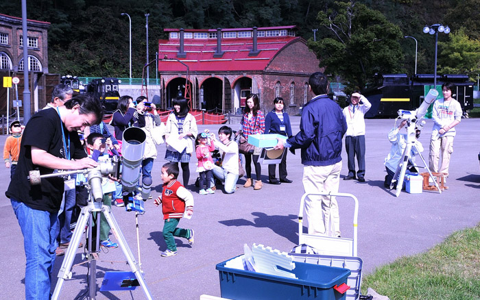 小樽市総合博物館では、と、10月8日(土)〜10日(月)の3日間、11:00より、本館アイアンホース中央駅前に、天文ボランティアの協力で設置した4基の望遠鏡で、太陽の黒点とプロミネンスを安全に観察できる。