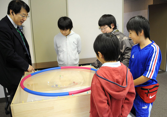 研修室では、小樽工業オリジナル「逆二乗団(ブラックホール)」は、太陽系をモデルにした科学説明機器で、今回初披露された。塩化ビニールの中心をくぼませた所を太陽とみたて、ビー玉で惑星を表現して重力を学ぶ。