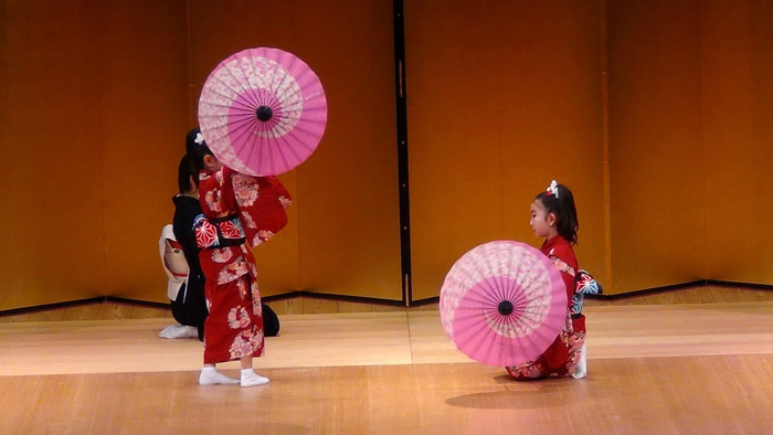 市内の小学生から高校生まで約80人が参加。出し物は9つに分かれ、初めに、小樽三曲協会「夕やけこやけ変奏曲」を、箏と尺八で演奏した。次はいけばな小原流小樽支部が、ロビーにも生け花を展示し、花の生け方をステージ上で披露した。日本舞踊藤間流扇玉会では、5名が「はなよめにんぎょう」を踊り、あまりの可愛らしさに沢山の拍手が沸き起こっていた。