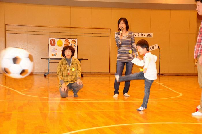 「パパは遊びの名人だ!」と題して、なかなか忙しくて子どもと遊べないお父さんが、一緒に広い体育館で体は動かして遊んだり、お話を聞いたり、体操・工作・ミニ運動会を通して子どもとふれあう第8回子育て講座が、11月20日(日)10:00〜11:00、いなきたコミュニティセンター(稲穂5)体育室で開かれた。主催は小樽市福祉部子育て支援課。