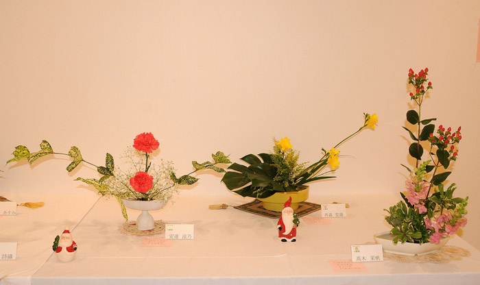 伝統文化いけばな子ども教室の作品は、小学生が対象。年8回の教室があり、習い始めて2・3年目の会員が多く、小学3年生の男の子も学んでいる。ひらくかたち・たてるかたち・かたむけるかたちをそれぞれに生け、クリスマスをイメージしたものもある。