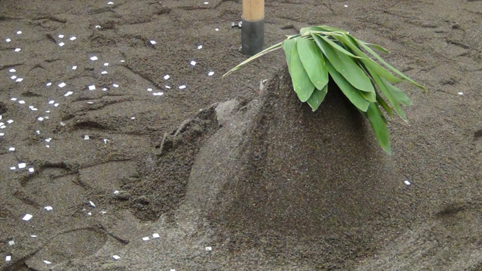 朝から雪模様の中、1日10:00から、築港地区のJR北海道の建設用地に建てられたテント内で、起工式が行われ、工事の安全を祈る神事と鍬入れ式が行われた。