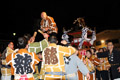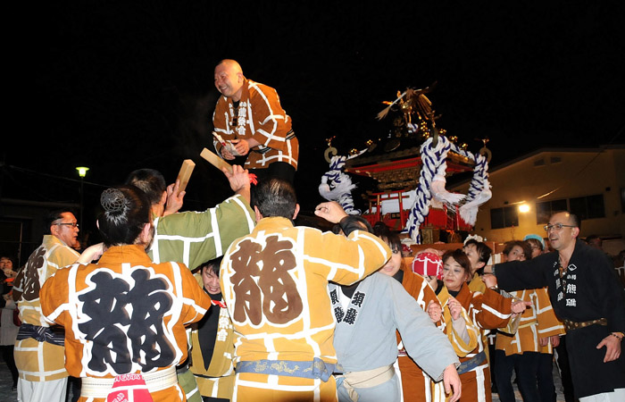 龍宮神社では、23:30から神輿が繰り出し、神社周辺を練り歩いた。威勢の良い神輿の担ぎ手は、熱気で寒さを吹き飛ばしていた。