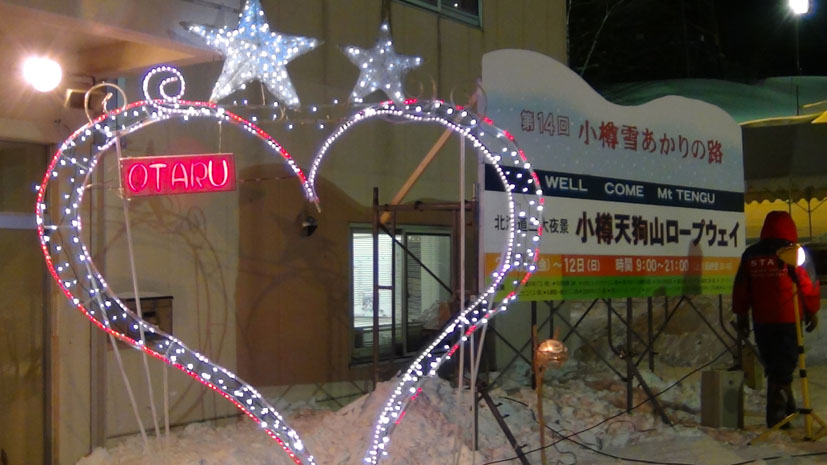 3日(金)から12日(日)までの10日間で開催される「小樽雪あかりの路14」(中村全博実行委員長)のオープニングセレモニーが、3日17:00から、小樽運河会場浅草橋街園で行われた。気温−3℃の寒さの中、会場には大勢の観客が集まった。中村実行委員長や中松市長の挨拶、点灯式の後、会場に作られたハートの大型オブジェにロウソクの灯りが灯る中に、小樽運河の浮き玉キャンドルが、柔らかな光を運河の水面に映し出し、10日間の日程がスタートした。