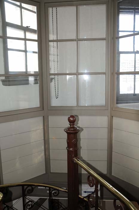 11日(土)14:00からのツアーでは、普段未公開の2階会議室に15名が入り説明を受けた。会議室から1階の様子を見ることもできる貴重な眺めを体験する。そして望楼へ。狭い螺旋階段を上って行くと円形の2つの窓があるスペースがあり、更に階段を上ると目当ての望楼に辿り着く。円形の部屋で、回りの景色を一望できるよういくつも窓がある。現在は建物が多く遠くの海が辛うじて見える程度だが、当時は、職員が小樽港の船の出入りの様子から経済情勢を分析していたという説がある。参加者は、初めて体験する望楼からの景色を楽しみ、昔を想像していた。