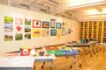 壁一面に張られているカラフルでインパクトのある作品は、昨年の学校祭の時に「ゴージャス」をテーマとして製作したもの。パソコンの中にある形を利用し、それに配色し、大きな紙にいくつも貼って作り上げた。ゴージャスな金色の中にカラフルな円形の数々の模様が来場者の目を引きつける。