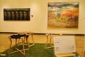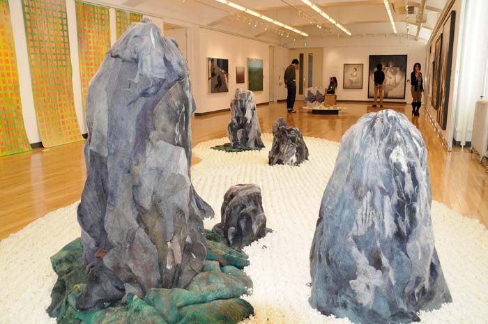 多目的ホールにひときわ目立つ、存在感ある作品「庭」と題して、フエルトを使用し、岩と砂を庭園のように仕上げた作品は、小樽出身の澁木智宏さんが制作。武蔵野美術大学造形学部工芸工業デザイン学科を卒業。砂をイメージした細かいフェルトで模様を作りながら敷き詰め展示し、大変な作業となった。