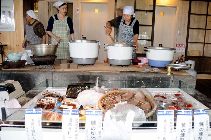 番屋内では、塩水ウニ1,500円と粒ウニ(塩漬け)800円。赤ガレイの一夜干し1枚100円は人気商品。堀内水産のニシンの炊き合わせ200g入り300円、鮭・にしんの昆布巻300円、小樽飯櫃より、たこザンギの販売とぎょうざのつめ放題500円など、販売コーナーも楽しめる品揃えとなっている。