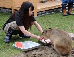 6日の予行演習では、らいでんスイカ1玉が用意され、何か匂うのか、お兄ちゃんのカピバラは、反応して寄ってきた。真っ赤な果肉がぎっしり詰まったみずみずしいスイカを、飼育員がバットに切り分けて与えると、1頭はあまり良い反応を示さないものの、2頭はシャリシャリと音を立てて美味しいそうに種も皮も食べていた。この可愛らしい姿に来館者も笑顔で見入っていた。