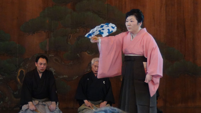 万作の会、旧岡崎家能舞台を生かす会・能楽体験ゼアミナールによる狂言「仁王」では、博打で負けてしまった男が、博打仲間に相談したところ、仁王尊に仕立て、お供え物を頂き、それを利用し、もう一勝負しようと提案する。大勢の参詣人が願いを込めてお供えを置いていく。足の悪い男が現れ、足が良くなるように願いを込めて、仁王の足を撫でる。くすぐったさに仁王の顔はゆがんでしまった。仁王に化けている姿や顔の表情に会場から笑いが沸き起こっていた。